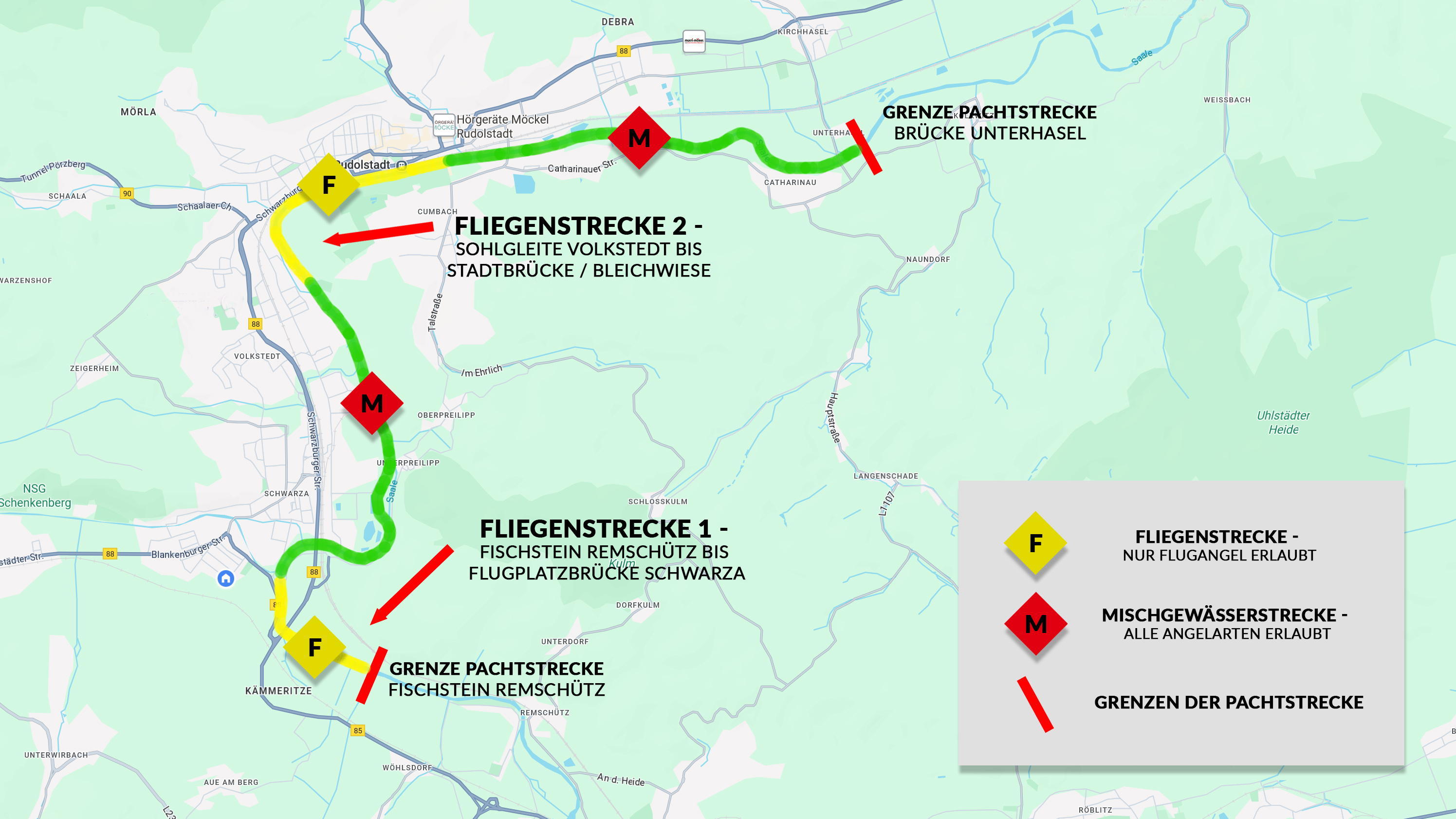 Die Beschilderung der einzelnen Gewässerstrecken insbesondere der Fliegenstrecken der Saale ist maßgeblich und zu beachten.